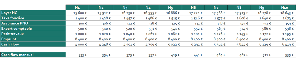 Le cash flow de l'immeuble est de 330 €/mois après paiement de la taxe foncière, frais de comptabilité, PNO et provision pour la réalisation de petit travaux.