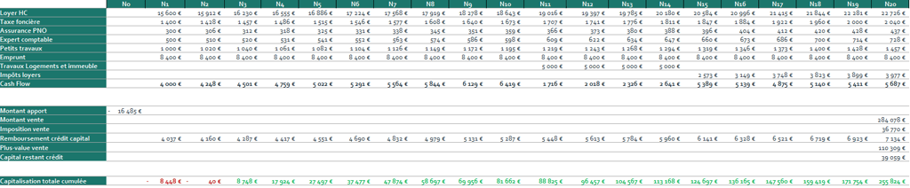 En cumulant le cash flow, le remboursement du prêt et la plus-value lors de la revente après imposition, l'ensemble déduit du capital initial, le bien immobilier sur 20 ans permettra à l'investisseur de capitaliser 255 000 €.