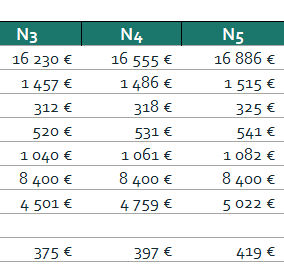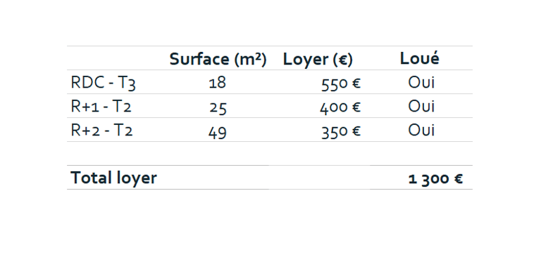 L'appartement du rez-de-chaussée, précédemment loué 500 € par mois, était vacant. Après quelques petits travaux, incluant la réfection des peintures et l'aménagement du mobilier, il a pu être reloué à 550 € par mois. Les revenus annuels générés par l'immeuble s'élèvent ainsi à 15 600 €.